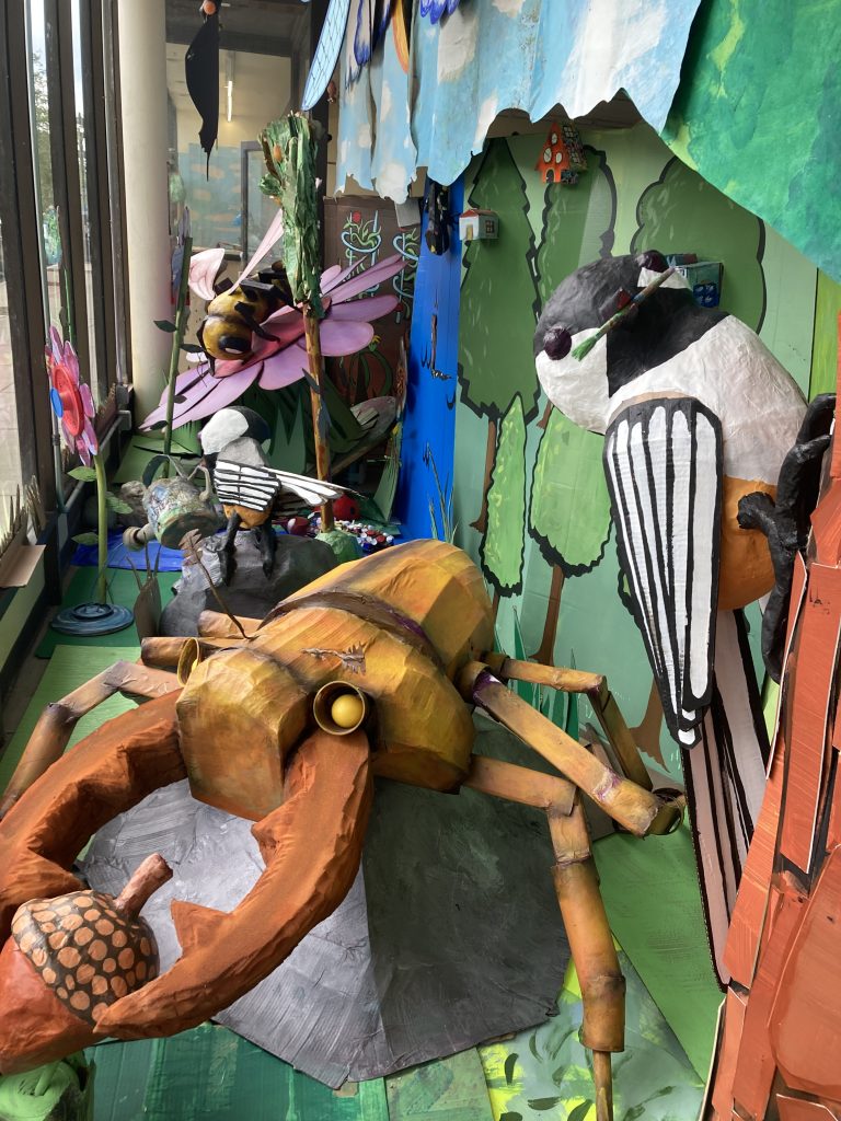 Earlier this year I started working inside of an abandoned Family Dollar in downtown Beverly, or as we locals like to call it, “Garden City”. Using cardboard, paper mache and 100% recycled materials, I filled it full of bugs, bats, birds, bees, beetles and more! Go check it out at 224 Cabot street, and see how many creatures you can spot!